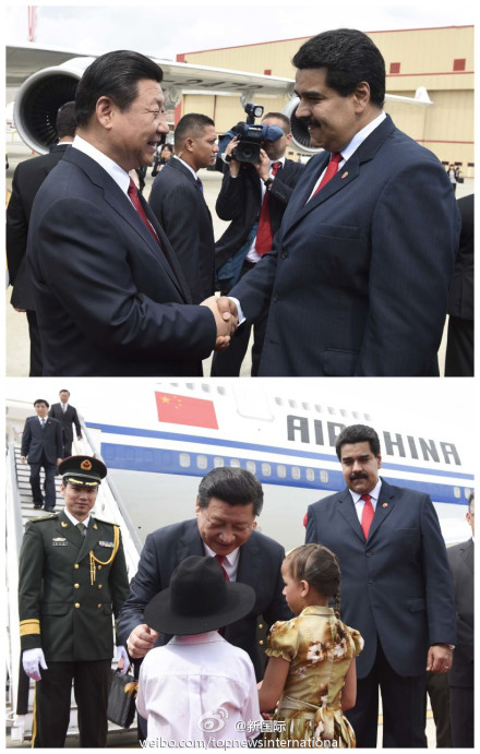 ????新華網(wǎng)北京7月21日電 據(jù)新華社“新國(guó)際”微博報(bào)道,經(jīng)過(guò)近7小時(shí)飛行,習(xí)近平主席當(dāng)?shù)貢r(shí)間20日下午飛抵加拉加斯。專(zhuān)機(jī)進(jìn)入委領(lǐng)空后,委空軍2架蘇-30戰(zhàn)機(jī)升空護(hù)航。馬杜羅總統(tǒng)親自到機(jī)場(chǎng)迎接。隨后,歡迎儀式在機(jī)場(chǎng)隆重舉行,習(xí)近平在馬杜羅陪同下檢閱儀仗隊(duì)。