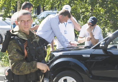 7月30日,烏克蘭頓涅茨克,歐安組織調(diào)查人員看地圖分析周圍安全形勢。由于烏內(nèi)戰(zhàn)仍在繼續(xù),調(diào)查人員已經(jīng)連續(xù)4天未能進(jìn)入MH17墜機(jī)現(xiàn)場。