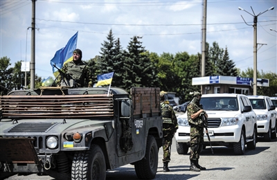 7月31日,烏克蘭政府軍車護送專家組車隊進入墜機現(xiàn)場。
