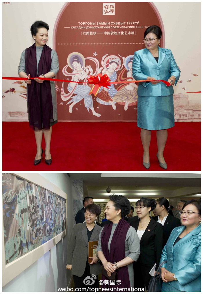 ???? 新華網(wǎng)北京8月22日電 據(jù)新華社“新國際”微博報道,習近平主席夫人彭麗媛和額勒貝格道爾吉總統(tǒng)夫人包勒爾瑪22日上午共同出席為慶祝中蒙建交65周年暨“中蒙友好交流年”舉行的中國文化周開幕式并剪彩,欣賞蒙古國藝術(shù)家的精彩演出,并參觀中國敦煌文化藝術(shù)展,觀賞臨摹的敦煌石窟壁畫、復(fù)制泥塑和樂器。