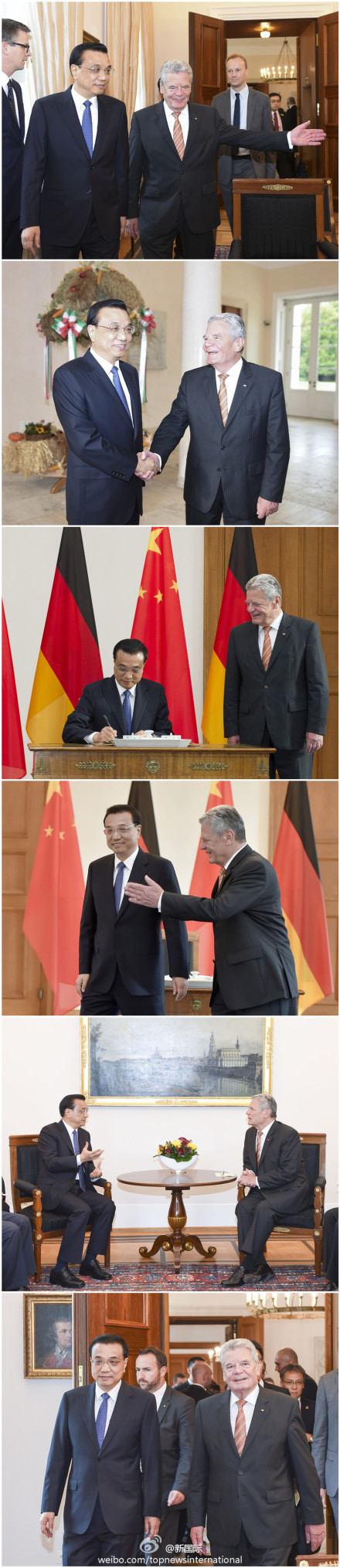 ????新華網(wǎng)北京10月10日電 據(jù)新華社“新國(guó)際”微博報(bào)道,10月10日上午,國(guó)務(wù)院總理李克強(qiáng)在柏林會(huì)見德國(guó)總統(tǒng)高克。李克強(qiáng)說,在中德雙方的共同努力下,兩國(guó)合作的深度和廣度達(dá)到前所未有的水平。中方愿同德方一道,充分理解對(duì)方國(guó)情,筑牢中德友好的基石,開辟兩國(guó)全方位戰(zhàn)略伙伴關(guān)系更加美好的前景。