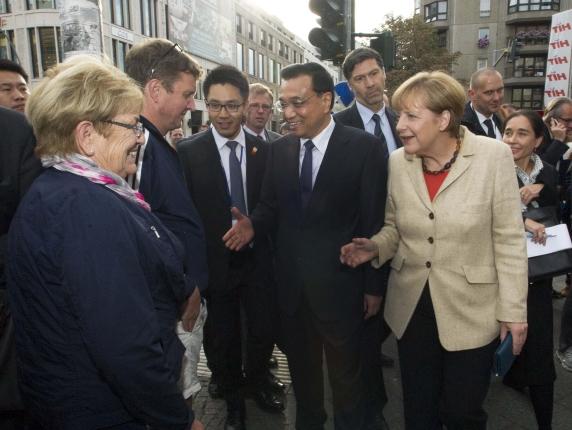 見到兩國總理到來,路邊不少民眾圍了上來,爭相與他們握手、合影。默克爾還把克強總理介紹給一位7、8歲的德國小女孩:“這是我的中國同事?!?/p>