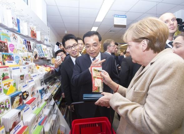 走進超市,兩位總理邊走邊逛,默克爾不時向克強總理介紹貨架上的商品。在一個擺滿明信片的架子前,克強總理停下腳步,打算選兩張明信片送給自己的夫人和女兒。
