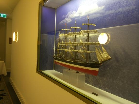 酒店布置得古香古色,每一層走廊兩側(cè)都裝飾有各種各樣與航海有關(guān)的物件——1900年的船長(zhǎng)塑像、1903年的古老帆船、1930年的船舵……