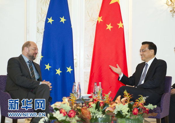 李克強(qiáng)指出,中國(guó)高度重視發(fā)展同包括歐洲議會(huì)在內(nèi)的歐盟機(jī)構(gòu)的關(guān)系,愿與歐方加強(qiáng)互信,深化合作,擴(kuò)大共同利益,通過對(duì)話與協(xié)商解決分歧。我期待不久后在米蘭出席第十屆亞歐首腦會(huì)議期間,同歐洲理事會(huì)主席范龍佩、歐盟委員會(huì)主席巴羅佐舉行會(huì)晤,回顧過去,展望未來,推動(dòng)中歐全面戰(zhàn)略伙伴關(guān)系取得新發(fā)展。期待歐洲議會(huì)繼續(xù)為此發(fā)揮積極作用。