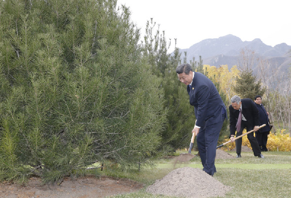 11時40分許,習(xí)主席與各成員經(jīng)濟(jì)體領(lǐng)導(dǎo)人或代表前往植樹。習(xí)主席在開幕辭中希望,亞太經(jīng)濟(jì)體以北京雁棲湖為新的起點,引領(lǐng)世界經(jīng)濟(jì)的雁陣,飛向更加蔚藍(lán)而遼闊的天空。