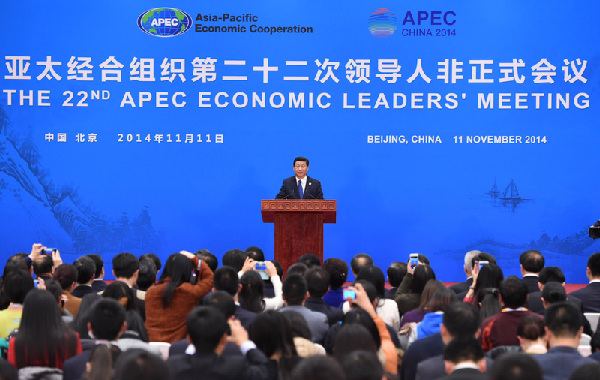 16時許,APEC領(lǐng)導(dǎo)人非正式會議圓滿結(jié)束后,習(xí)主席出席記者會并講話。