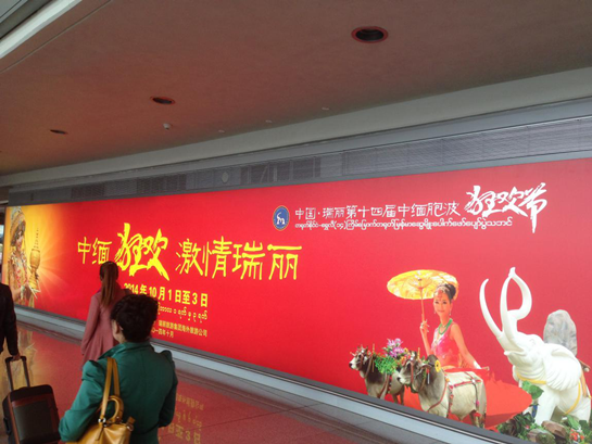11月10日,記者在昆明長水國際機(jī)場轉(zhuǎn)機(jī)前往緬甸時在機(jī)場拍下的中緬胞波狂歡節(jié)宣傳廣告。(新華社記者 桂濤攝)