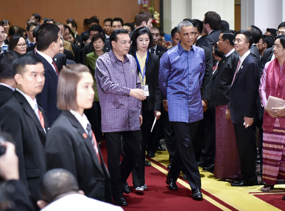 晚宴前,18位與會國領(lǐng)導(dǎo)人和潘基文身著緬甸特色服飾,站在印有緬甸名勝大金寺、大金石圖案的背景板前合影,克強(qiáng)總理站在正中間,“東道主”吳登盛一邊是奧巴馬,一邊是克強(qiáng)總理,足見主辦方對中國的重視。
