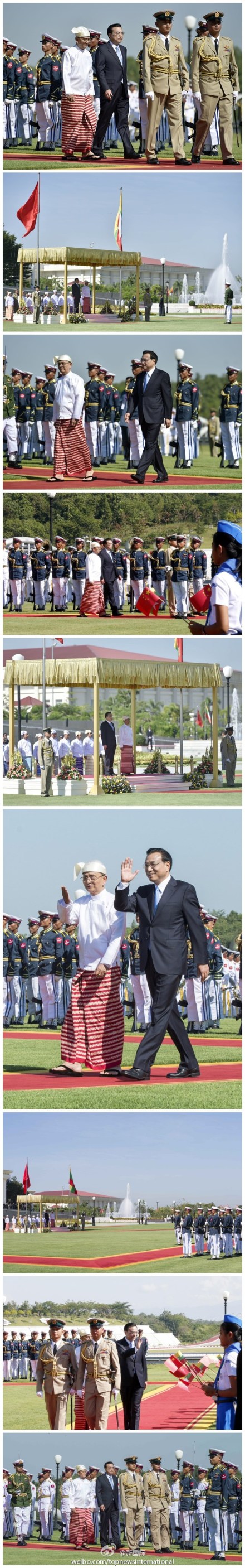 ??? 新華網(wǎng)北京11月14日電 據(jù)新華社“新國際”微博報道,緬甸總統(tǒng)吳登盛14日在內(nèi)比都總統(tǒng)府前廣場舉行隆重儀式,歡迎中國國務(wù)院總理李克強對緬甸進行正式訪問。這是李克強就任總理以來首次訪問緬甸。