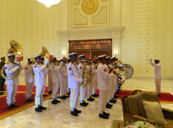11月14日,緬方軍樂隊(duì)在為李克強(qiáng)總理舉行的歡迎午宴上奏響兩國(guó)國(guó)歌。