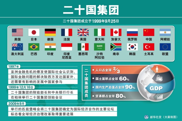 可以說,中國成功地引領(lǐng)了亞太區(qū)域合作方向與政策制定,極大地增強了中國在亞太治理中的發(fā)言權(quán)。如果說,APEC是一個成員限于亞太地區(qū)的區(qū)域性治理平臺,那二十國集團(G20)就是一個覆蓋面更廣的、全球性的治理平臺。G20由西方七國集團、俄羅斯和中國等主要新興經(jīng)濟體組成,經(jīng)濟規(guī)模約占全球90%,貿(mào)易總額占全球總量的80%。