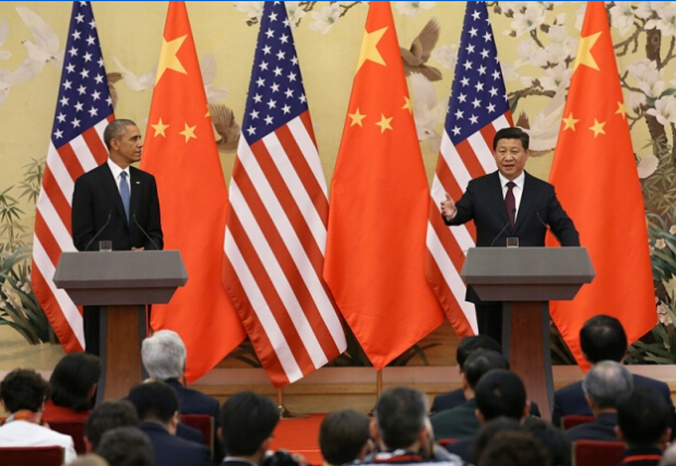 圖為11月12日,國家主席習(xí)近平在北京人民大會(huì)堂與來訪的美國總統(tǒng)奧巴馬舉行會(huì)談后,共同會(huì)見記者。
