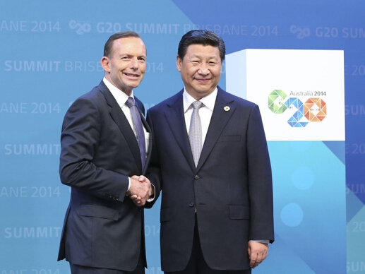 圖為11月15日,澳大利亞總理阿博特在布里斯班迎接習(xí)近平主席。