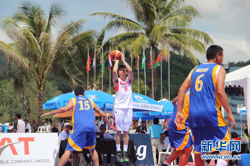 ??? 11月16日,中國沙灘籃球運動員劉洺宇(中)在比賽中。中國體育代表團16日在泰國普吉舉行的第四屆亞洲沙灘運動會上勇奪2枚金牌和2枚銅牌。當天比賽全部結(jié)束時,中國隊以3金2銀5銅的成績暫列獎牌榜第五。新華社發(fā)(塔納攝)