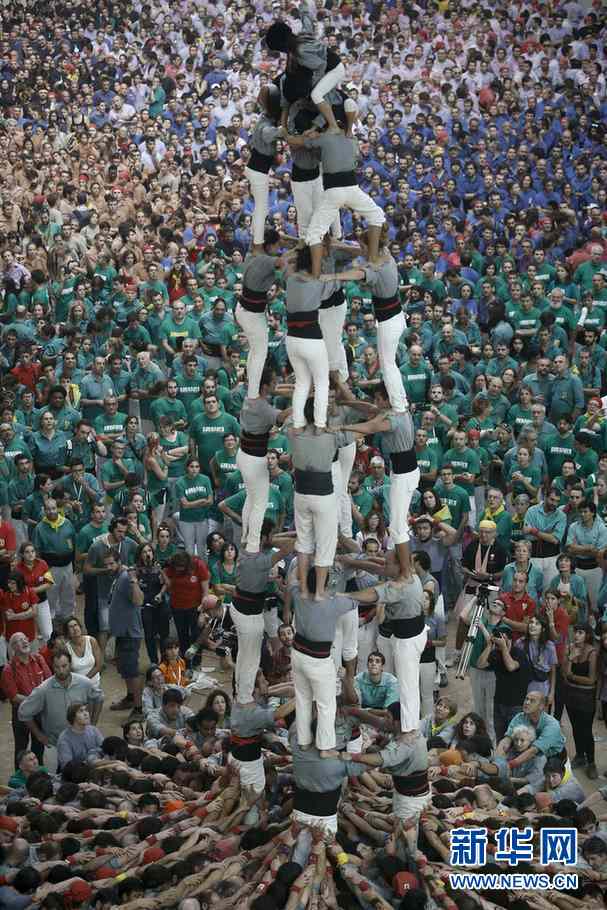 ????在西班牙加泰羅尼亞地區(qū)的塔拉戈納市(Tarragona)舉行的一次“疊人塔”大賽上,Jana爬到Sants區(qū)代表隊的頂端。新華社巴塞羅那分社攝影師Pau Barrena 攝?