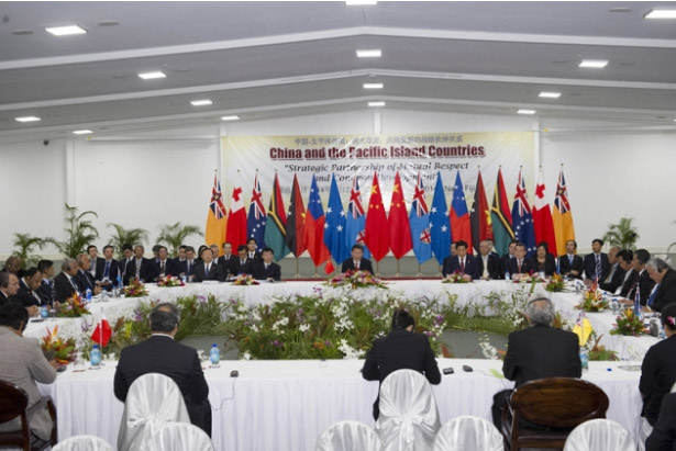 ????會(huì)議廳寬敞明亮,背景布上醒目地用中英文寫著“中國—太平洋島國:相互尊重、共同發(fā)展的戰(zhàn)略伙伴關(guān)系”。這一伙伴關(guān)系的確立,是習(xí)主席和8位島國領(lǐng)導(dǎo)人一致同意的重要成果。背景布前面擺著中國和8個(gè)太平洋島國的國旗,很是好看。整個(gè)會(huì)議廳,被布置得喜氣洋洋。