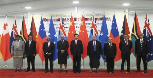 ????當(dāng)?shù)貢r(shí)間下午近6點(diǎn),習(xí)主席在國旗前迎候8個(gè)太平洋島國的領(lǐng)導(dǎo)人,與他們一一握手,然后請大家站在一起合影。“咔嚓”聲四起,中國和太平洋島國關(guān)系史上具有歷史意義的瞬間,就此定格。