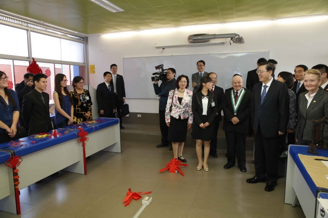 ??? 22日,全國人大常委會委員長張德江參觀秘魯里卡多·帕爾瑪大學(xué)孔子學(xué)院,與在這里學(xué)習(xí)中文的秘魯學(xué)生交流。
