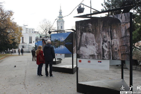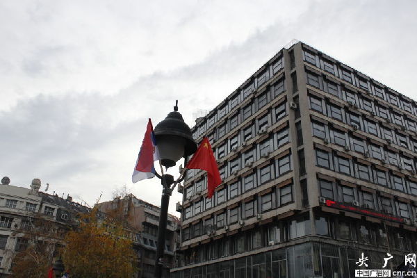 ??? 盡管人們穿著厚厚的外衣,但貝爾格萊德卻并不寒冷,更像是秋天剛剛來到。這兩天,無論是新城區(qū)還是傳統(tǒng)的舊城都紛紛出現(xiàn)了中國的色彩。舊城米哈伊洛大公街附近,幾條馬路都掛起了中塞兩國的國旗??ㄈR梅格丹城堡還正在進(jìn)行「世界遺產(chǎn)在中國」圖片展。最神奇的是,記者偶遇的一位老奶奶,得知記者come from China后,立刻用中文唱起了“我愛你中國”,瞬間親切了很多。