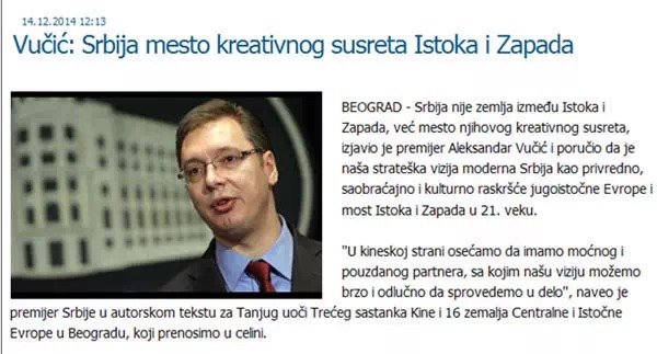 ????塞爾維亞總理武契奇14日在塞爾維亞南通社發(fā)表題為《塞爾維亞是東西方創(chuàng)造性相遇的地方》的署名文章。文章稱,塞爾維亞不是夾在東西方之間的國家,而是東西方創(chuàng)造性相遇的地方。他表示,一個現(xiàn)代化的塞爾維亞(應(yīng))成為東部歐洲經(jīng)濟(jì)、交通、文化的交叉點(diǎn)以及21世紀(jì)東西方的橋梁。他說,中國是強(qiáng)大的和值得信賴的伙伴,通過同中國的合作,塞爾維亞可以很快、堅(jiān)定地去實(shí)施自己的戰(zhàn)略預(yù)想。武契奇還引用《孫子兵法》作者孫武的話“如果你善于利用機(jī)會,機(jī)會會增加”,表示賽爾維亞將緊緊抓住現(xiàn)在的機(jī)遇,為自己的發(fā)展創(chuàng)造新的機(jī)會。