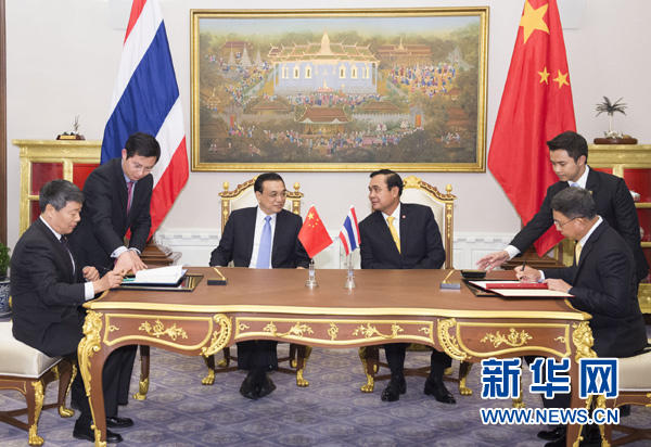 ????12月19日,國務(wù)院總理李克強在曼谷會見泰國總理巴育。這是會見后,兩國總理共同見證《中泰鐵路合作諒解備忘錄》和《中泰農(nóng)產(chǎn)品貿(mào)易合作諒解備忘錄》的簽署。新華社記者黃敬文攝