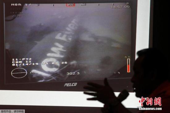 資料圖:當(dāng)?shù)貢r(shí)間2015年1月14日,印尼雅加達(dá),印尼國(guó)家搜救隊(duì)召開(kāi)新聞發(fā)布會(huì),展示新加坡海軍提供的亞航QZ8501航班機(jī)身圖像。