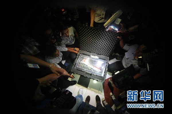 ??? 1月12日,在印度尼西亞雅加達(dá),工作人員打開裝有亞航失事客機(jī)黑匣子的箱子。印度尼西亞國家交通安全委員會(huì)主席塔唐·庫爾尼亞迪12日說,搜救人員當(dāng)天早上打撈起的失事亞航客機(jī)其中一個(gè)黑匣子——飛行數(shù)據(jù)記錄器狀態(tài)良好。新華社發(fā)(阿貢攝)