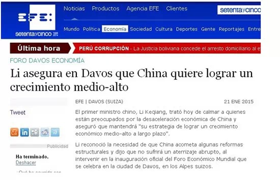 22日,西班牙埃菲社報道了李克強總理在達沃斯世界經濟論壇上的致辭,特別提到他就中國經濟增速放緩的回應。報道中引用李克強總理的話:“中國經濟進入新常態(tài),經濟由高速增長轉為中高速增長。發(fā)展則必須由中低端水平邁向中高端水平,為此要堅定不移地推動結構性改革?!?/p>