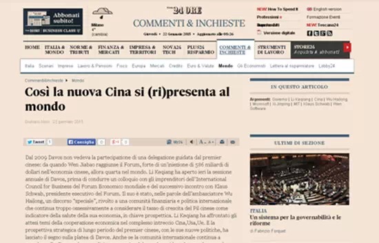 意大利24小時太陽報1月22日發(fā)表題為《中國重新向世界自我介紹》的評論性文章,介紹了李克強在世界經濟論壇上的講話。文章稱,雖然國際社會一直在用西方國家的種族主義中心心態(tài)以及舊的眼光看待中國,中國國務院總理李克強的長期戰(zhàn)略眼光和他的新政策還是給達沃斯的聽眾們留下深刻印象。