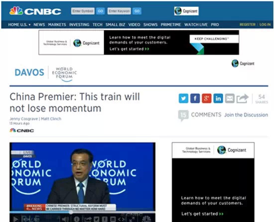 華爾街日報、彭博新聞社、金融時報、CNBC和美聯(lián)通訊社等美國主流媒體,都報道了李克強總理在達沃斯論壇上有關中國將避免經濟硬著陸,以及確保在中長期經濟有所增長的講話。
