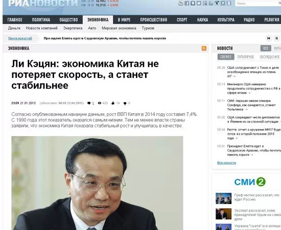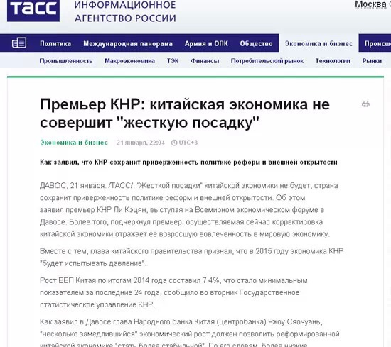塔斯社發(fā)表了一篇名為《中國總理:中國經濟不會硬著陸》的文章。文中指出,李克強和中國央行行長周小川在達沃斯論壇期間均表示,中國將深化改革開放,漸緩的增長速度有利于中國經濟的轉型。在3月份舉行的中國兩會上,中國政府將提出新的經濟發(fā)展規(guī)劃,速度肯定不會是北京追求的首要目標。