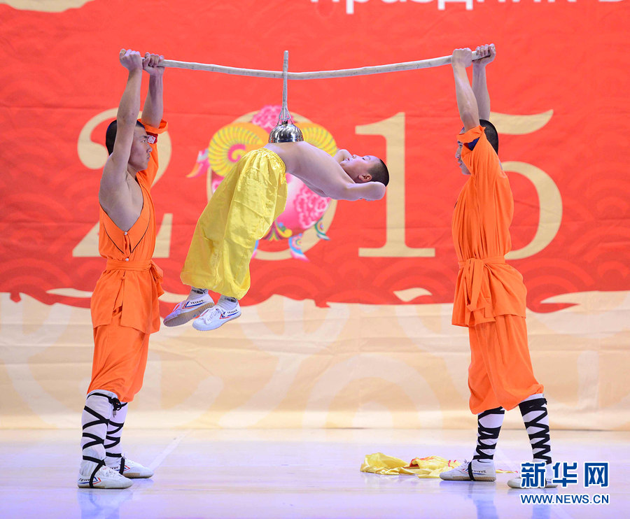 2月4日晚,在烏茲別克斯坦首都塔什干突厥宮,藝術家在表演中國武術和舞蹈。新華網記者 沙達提 攝
