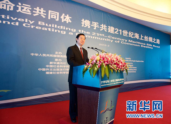 2月12日,中共中央政治局委員、中央書記處書記、中宣部部長劉奇葆出席在福建泉州召開的21世紀海上絲綢之路國際研討會,發(fā)表《揚帆海上絲路 實現(xiàn)共贏發(fā)展》的主旨演講。新華社記者 姜克紅 攝