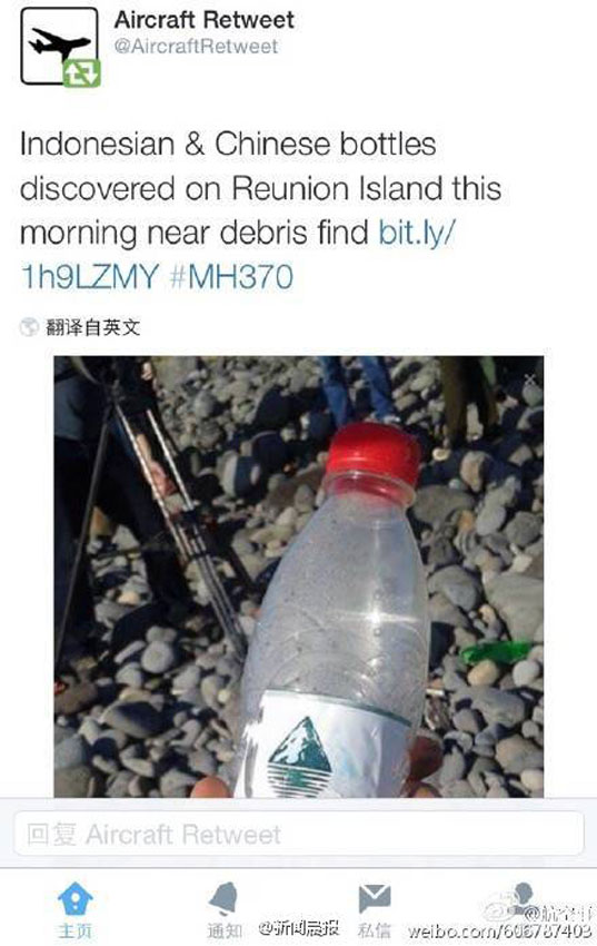 疑似MH370殘骸地發(fā)現(xiàn)中國礦泉水瓶(組圖)