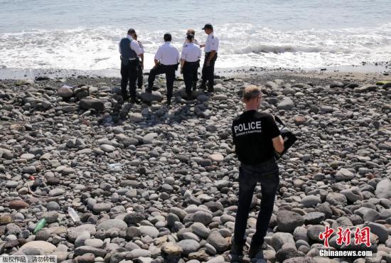 當?shù)貢r間8月2日,法屬留尼旺首府圣但尼附近的一處海灘上,警員正在現(xiàn)場對金屬殘片進行勘察。