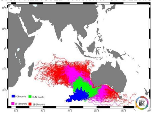 根據(jù)這個模型,MH370的殘骸可能在18-24個月出現(xiàn)在下圖中的紅色區(qū)域,法屬留尼汪島就在紅色區(qū)域內(nèi)。