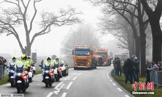 資料圖:當(dāng)?shù)貢r(shí)間2014年12月9日,運(yùn)送馬航MH17航班殘骸的卡車車隊(duì)定于抵達(dá)荷蘭南部的希爾澤.賴恩空軍基地。接下來(lái),空難調(diào)查人員將利用殘骸再次拼裝這架客機(jī),以期找出失事原因。