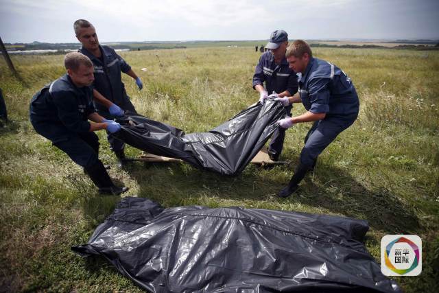 2014年7月19日,在烏克蘭頓涅茨克州的MH17航班墜機(jī)現(xiàn)場,烏克蘭緊急情況部工作人員搬運(yùn)遇難者遺體。新華社/路透