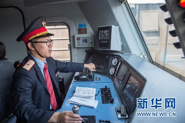 10月15日,第1000列中歐班列開行前,重慶機務(wù)段執(zhí)行本次班列駕駛?cè)蝿?wù)的司機王銘杰在駕駛室內(nèi)進(jìn)行開行前的操作。當(dāng)日11時45分,載著筆記本電腦等51個集裝箱貨物的中歐班列,緩緩駛出重慶團(tuán)結(jié)村站,駛向1.1萬公里之外的德國杜伊斯堡。這是第1000列往來中國和歐洲之間的國際貨運列車。新華社記者劉潺攝