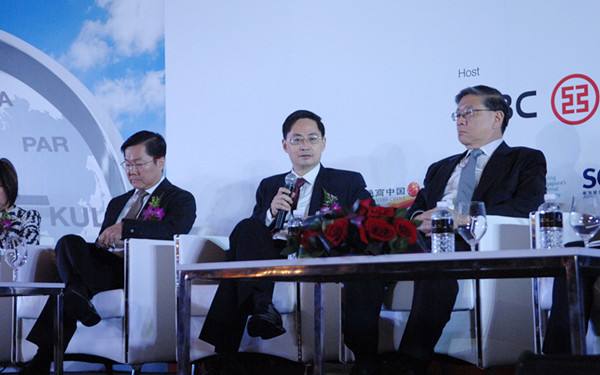 圖為2014年9月22日,中國(guó)人民銀行首席經(jīng)濟(jì)學(xué)家馬駿(中)在工行新加坡分行舉辦的人民幣國(guó)際化峰會(huì)上分享看法。當(dāng)日,中新兩國(guó)金融及其他企業(yè)界人士、政府官員等數(shù)百人參加了舉行的人民幣國(guó)際化峰會(huì),共同討論人民幣國(guó)際化的前景和路徑。