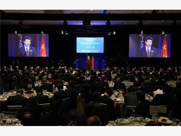 ——習(xí)主席2015年9月22日在美國華盛頓州西雅圖市,出席華盛頓州當(dāng)?shù)卣兔绹押脠F(tuán)體聯(lián)合舉行的歡迎宴會時發(fā)表演講。