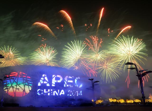 2014年11月10日,北京在奧林匹克公園舉行焰火表演。APEC第二十二次領(lǐng)導(dǎo)人非正式會(huì)議2014年11月10日至11日在北京舉行。新華社記者羅曉光攝