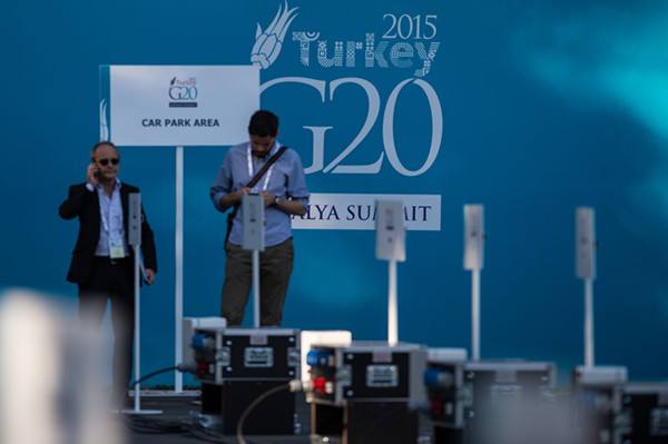 2015年11月14日 11月13日,在土耳其安塔利亞,記者在G20峰會(huì)媒體區(qū)工作。 新華社記者潘超越攝