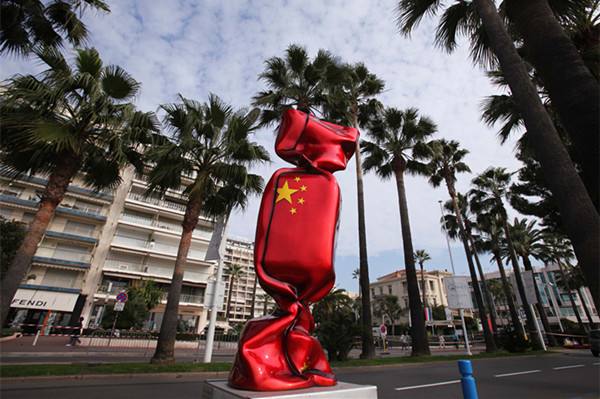 2011年11月3日至4日,G20領(lǐng)導(dǎo)人峰會(huì)在戛納舉行。圖為10月31日在法國南部小城戛納拍攝的外表被包裝成中國國旗的糖果雕塑。新華社記者高靜攝