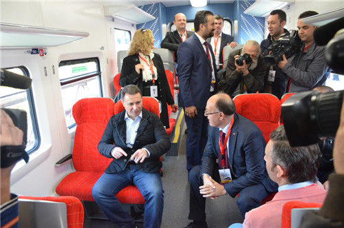 當(dāng)天,馬其頓鐵路運輸公司為其從中國中車集團株洲電力機車有限公司采購的首列電力動車組舉行試運行儀式。格魯埃夫斯基等多名馬其頓政府高官、馬鐵路運輸公司總經(jīng)理科斯托夫、中國駐馬其頓大使溫振順應(yīng)邀出席儀式并試乘動車組。