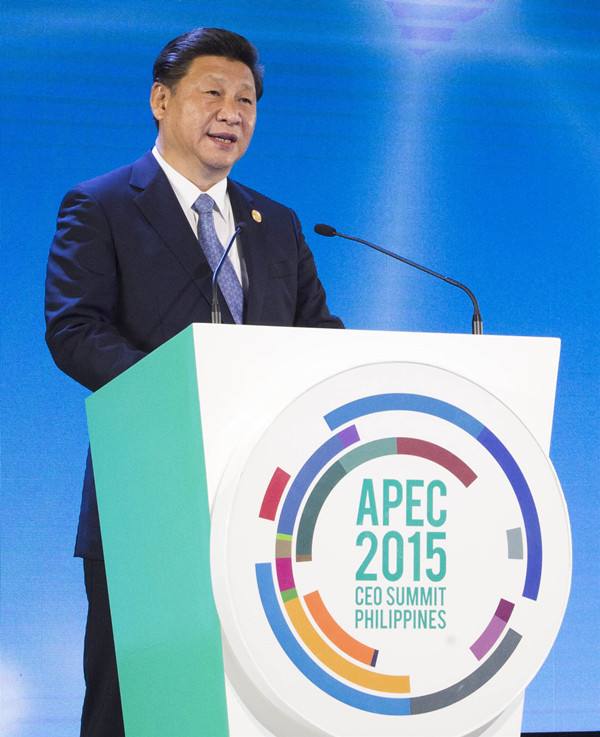 2015年11月18日,國家主席習(xí)近平在菲律賓馬尼拉出席亞太經(jīng)合組織工商領(lǐng)導(dǎo)人峰會(huì)并發(fā)表主旨演講。