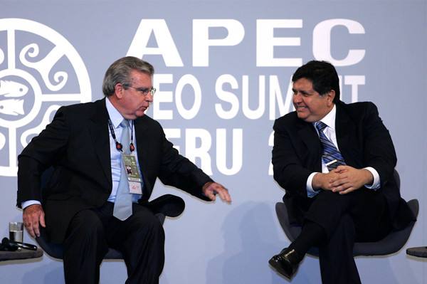 2008年11月21日,秘魯總統(tǒng)加西亞(右)與APEC工商領(lǐng)導(dǎo)人峰會(huì)主席莫拉萊斯在開幕式上交談。