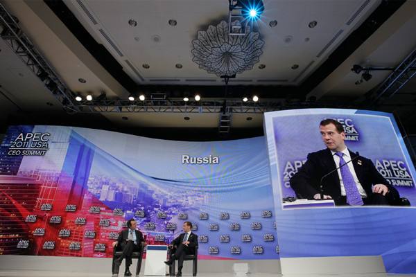 2011年11月13日,俄羅斯總統(tǒng)梅德韋杰夫出席在美國夏威夷州首府檀香山舉行的APEC工商領(lǐng)導(dǎo)人峰會(huì)。