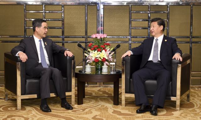 11月18日,國家主席習(xí)近平在菲律賓馬尼拉會見前來出席亞太經(jīng)合組織第二十三次領(lǐng)導(dǎo)人非正式會議的香港特別行政區(qū)行政長官梁振英。(新華社記者謝環(huán)馳攝)